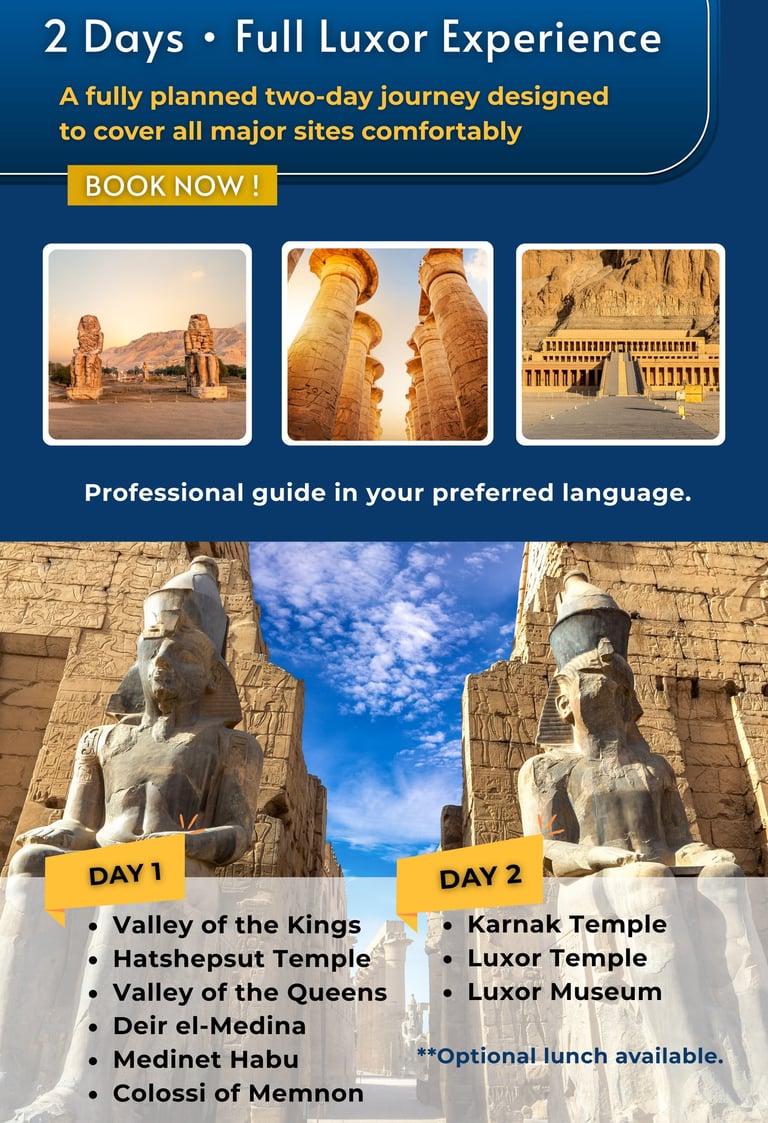 We’ve designed the perfect two-day tour to help you experience the best of Luxor with ease. Together with our professional guides, we’ve created a carefully planned itinerary that lets you focus on enjoying your stay and exploring Luxor’s incredible ancient wonders. Booking this experience as a combination tour also helps save you money, giving you more value for your time.