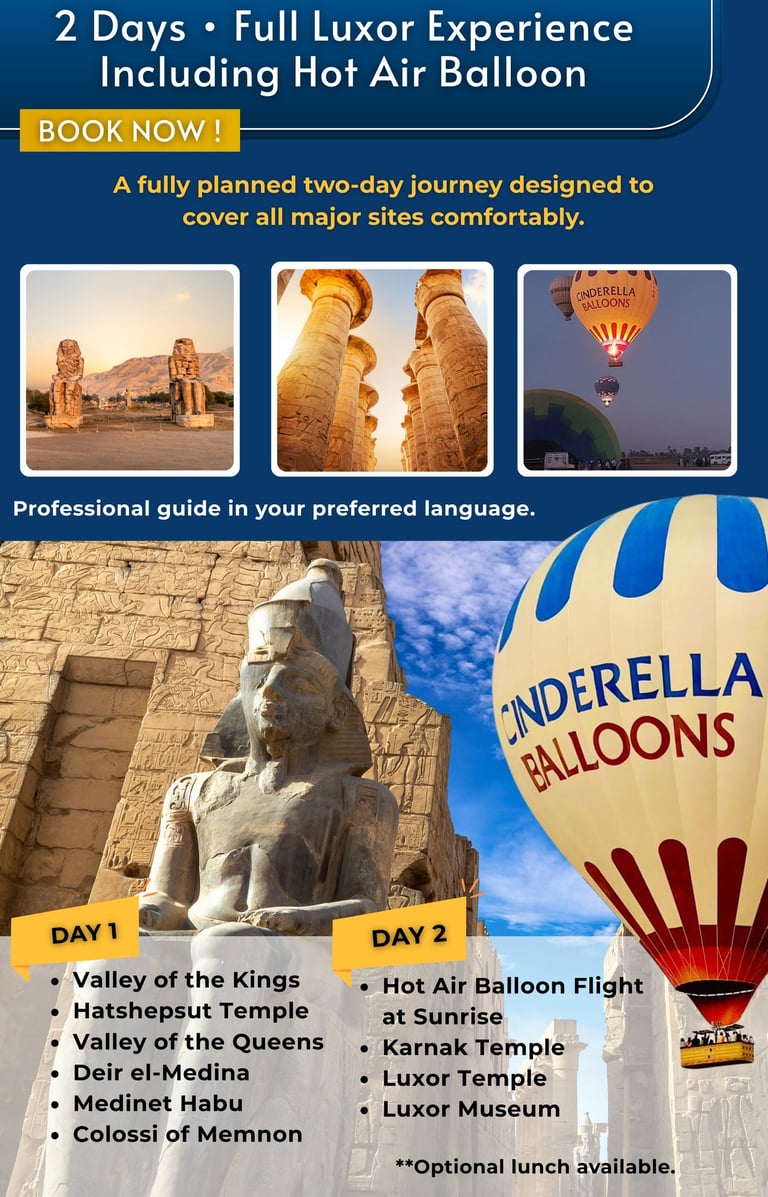 This tour offers the same in-depth Luxor experience over two days, covering both the West and East Banks, but without the hot air balloon flight. You’ll still enjoy a carefully planned itinerary designed to let you relax and fully explore Luxor’s incredible ancient sites, guided by our professional team.